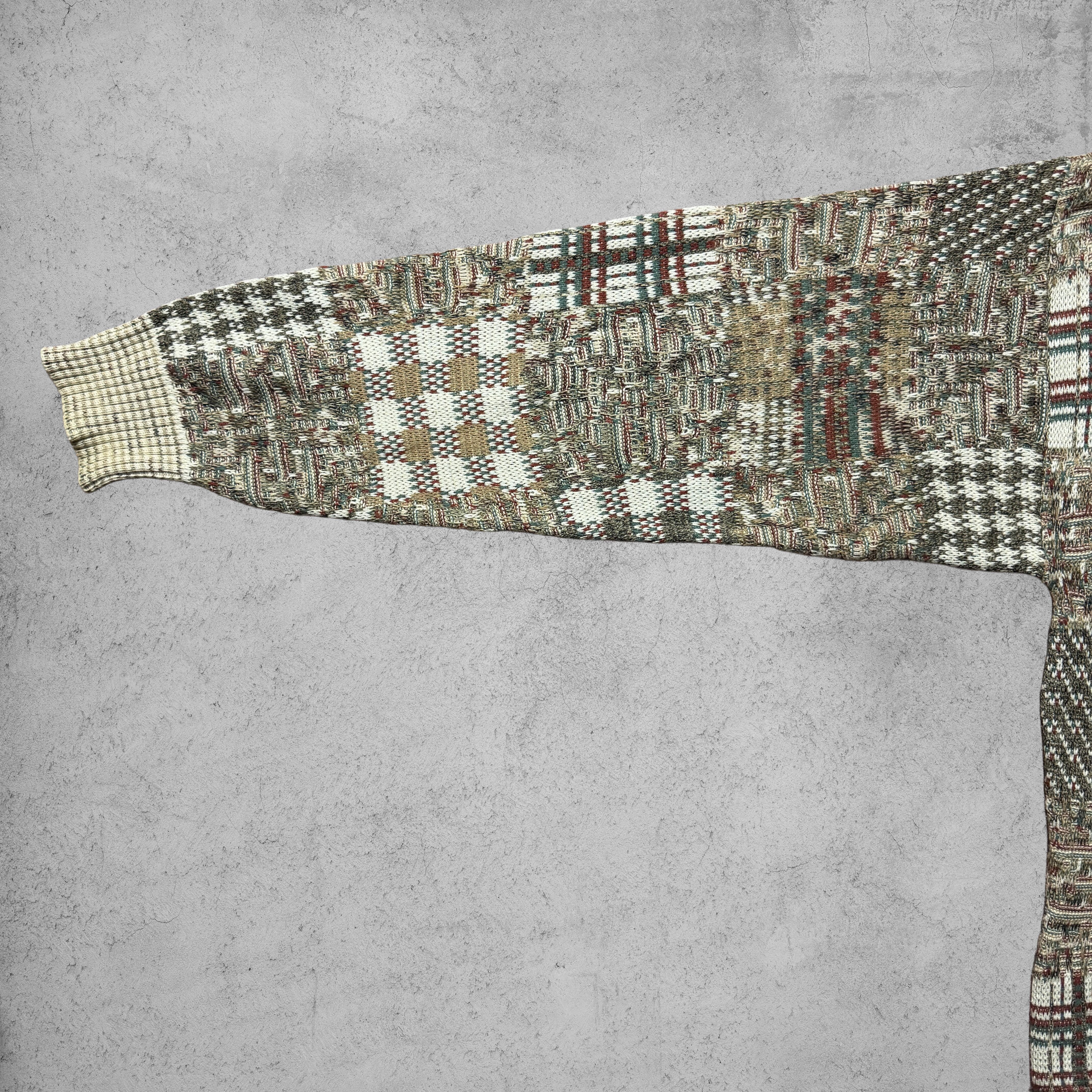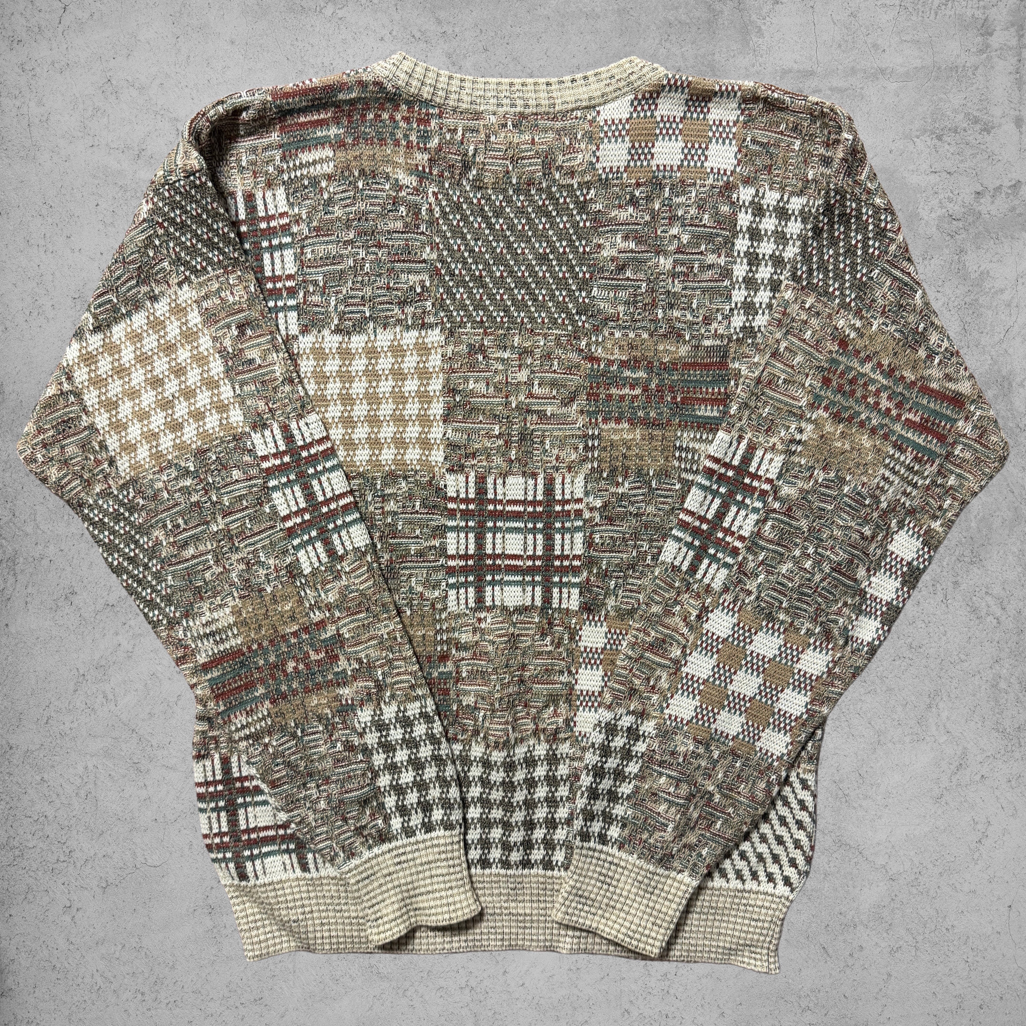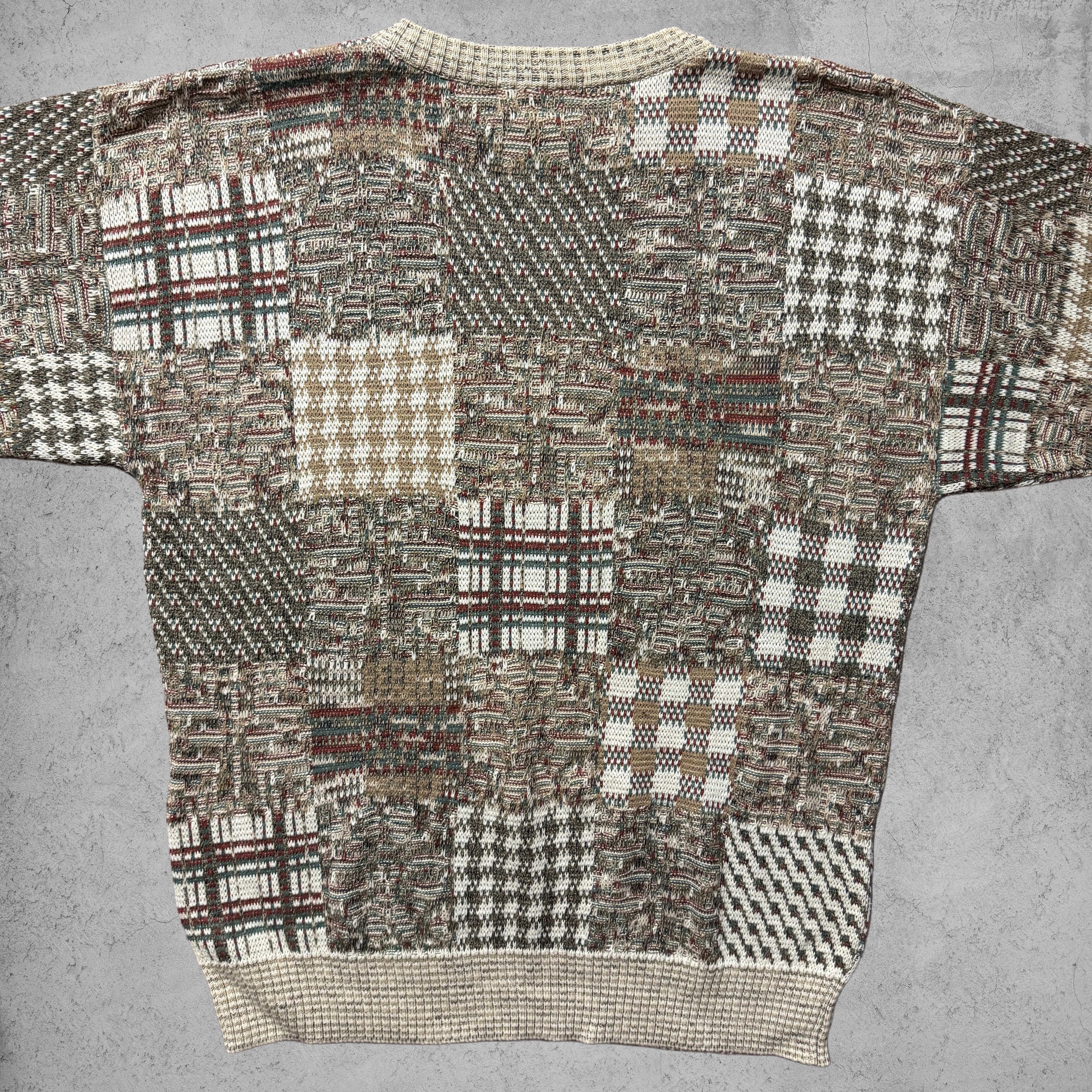複数のチェック柄・織り柄を組み合わせたパッチワーク調デザインが最大の特徴のクルーネックニット。ブラウン、ベージュ、オリーブ、ボルドーなどアースカラーを基調とした配色で、情報量は多いが落ち着いた印象にまとまっている。