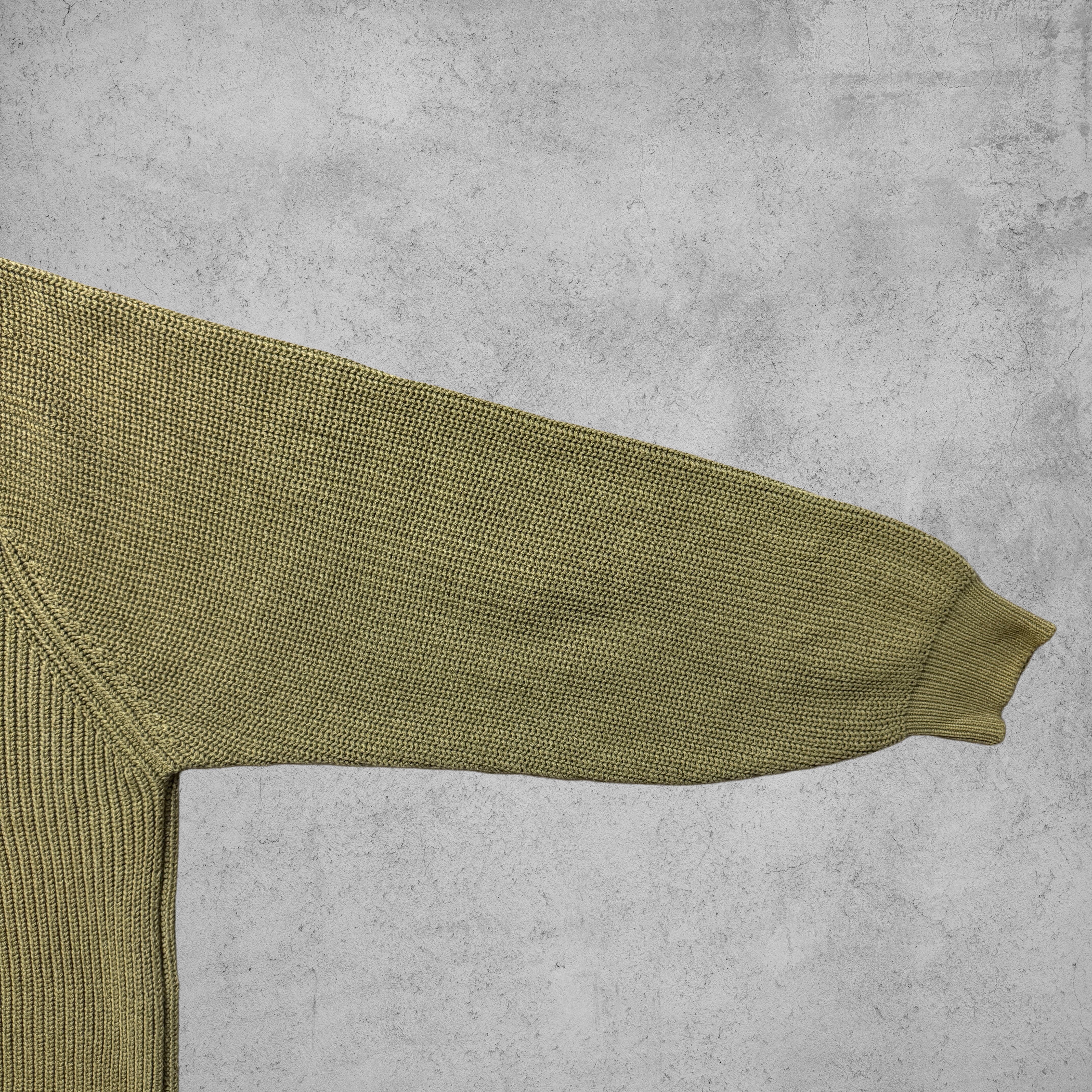スタンドカラー仕様に布帛切り替えのボタンネック、肘部分には同色系のエルボーパッチを配した、クラシックな意匠が魅力のニットトップス。オリーブ寄りの落ち着いたグリーンカラーで、ミリタリーやハンティングウェアの空気感も感じさせる一枚。