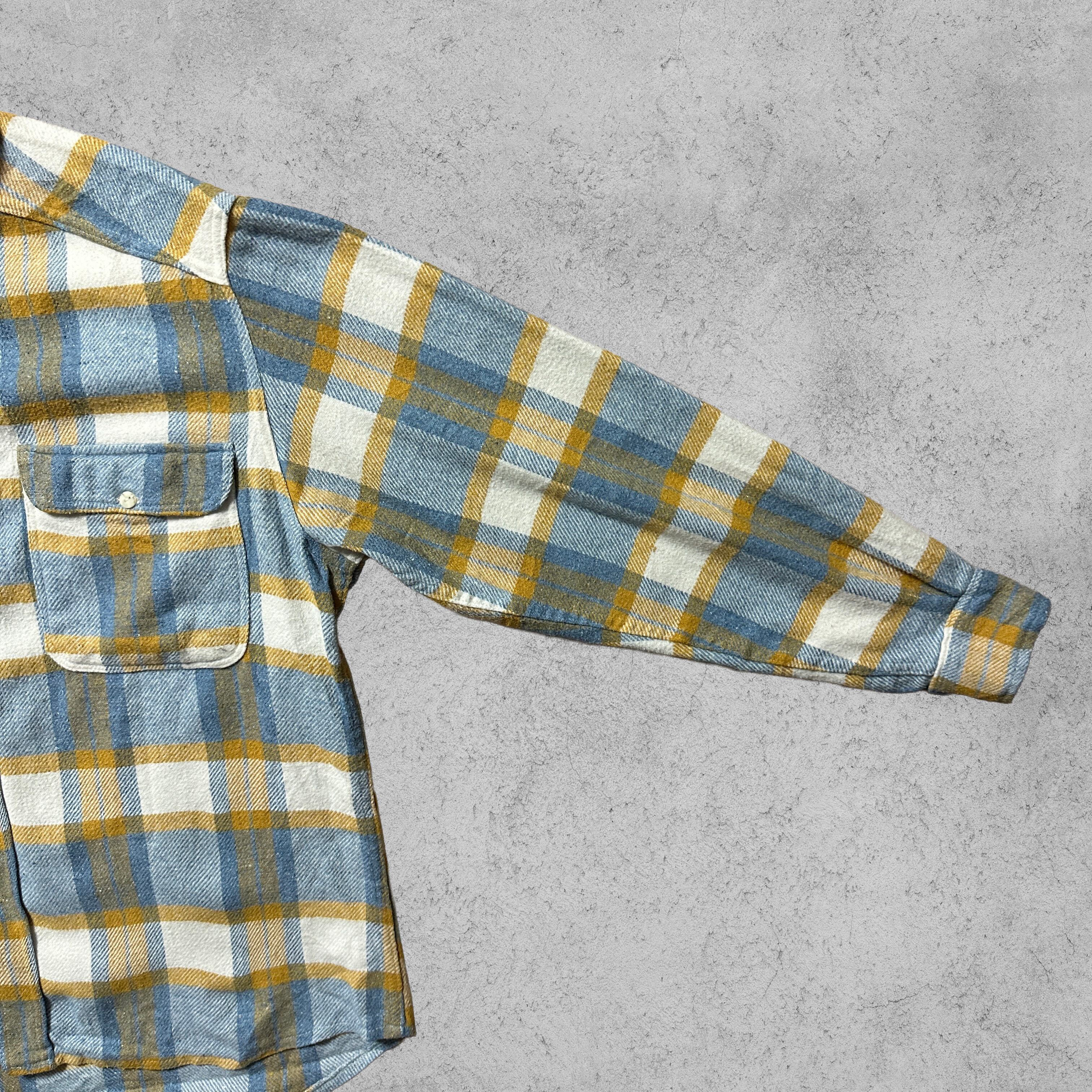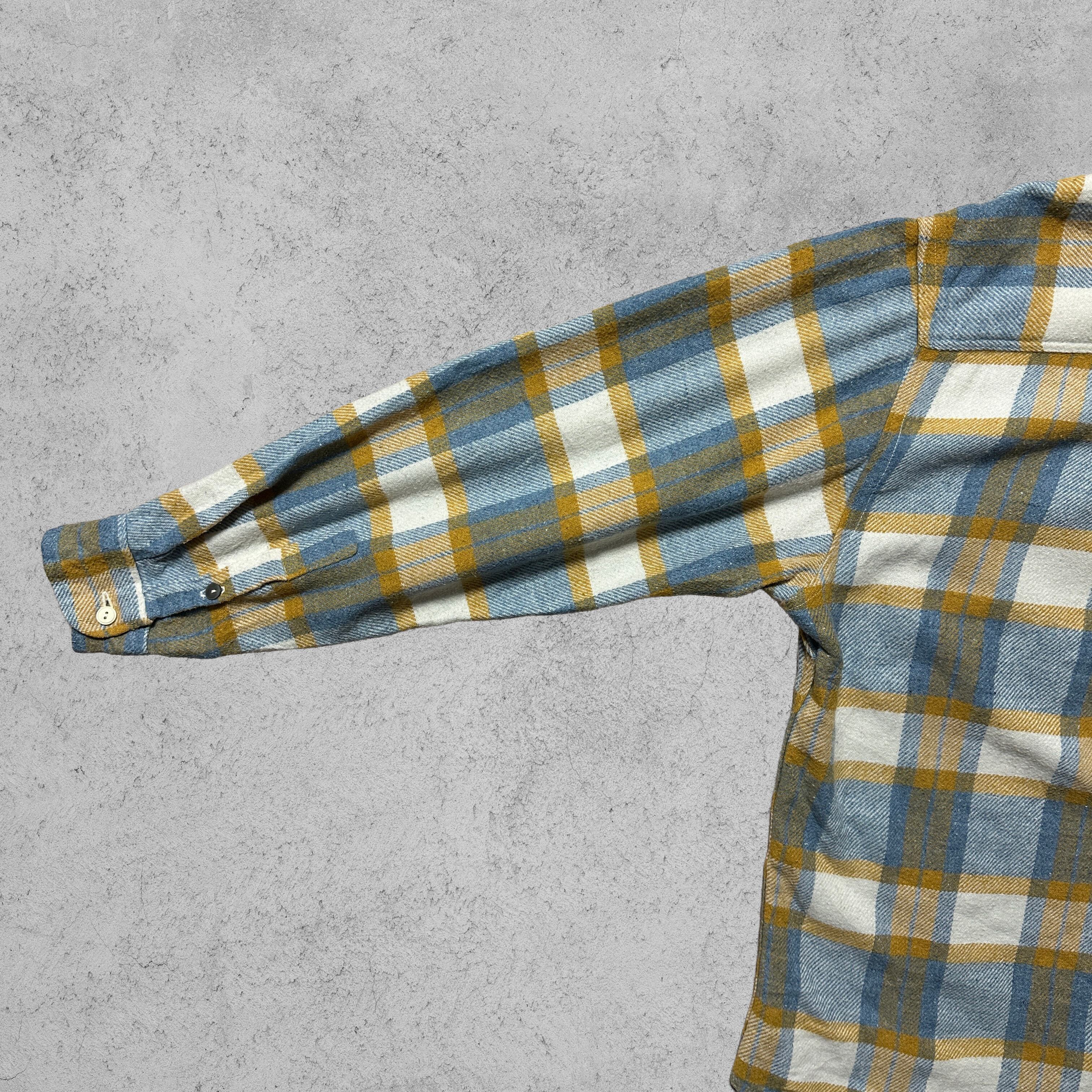 ブルー×ホワイトをベースに、マスタードイエローが効いたクラシックなチェック柄が魅力のフランネルシャツ。両胸フラップポケット、緩やかなラウンドカットの裾など、王道のワークシャツディテールを押さえた一枚。配色は柔らかく、無骨すぎず、街着としても取り入れやすいバランス。