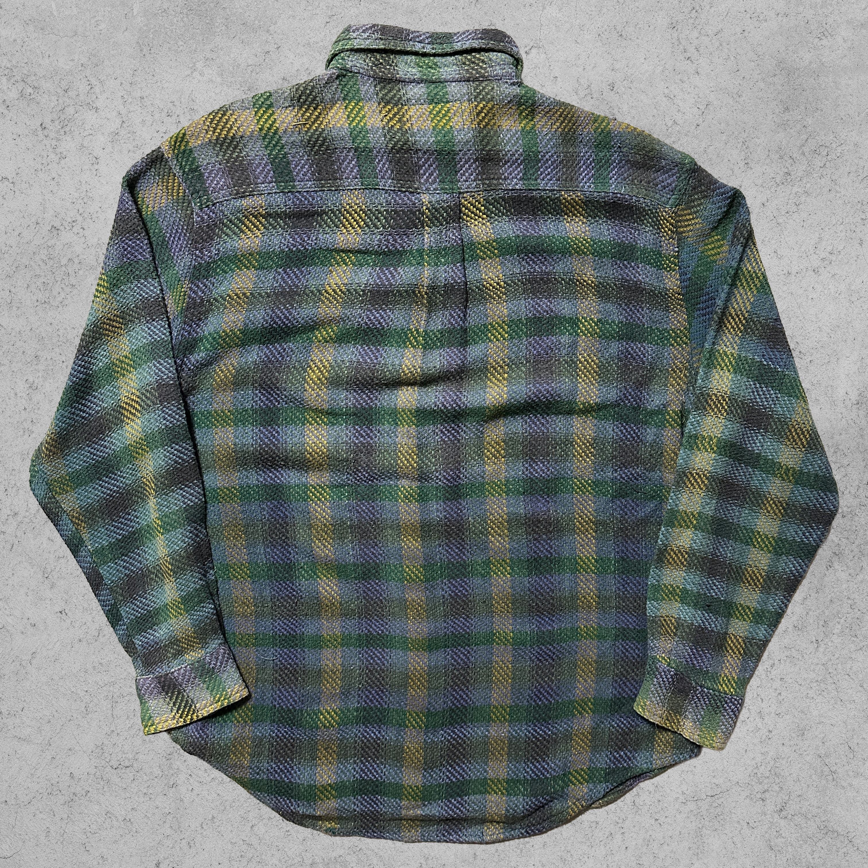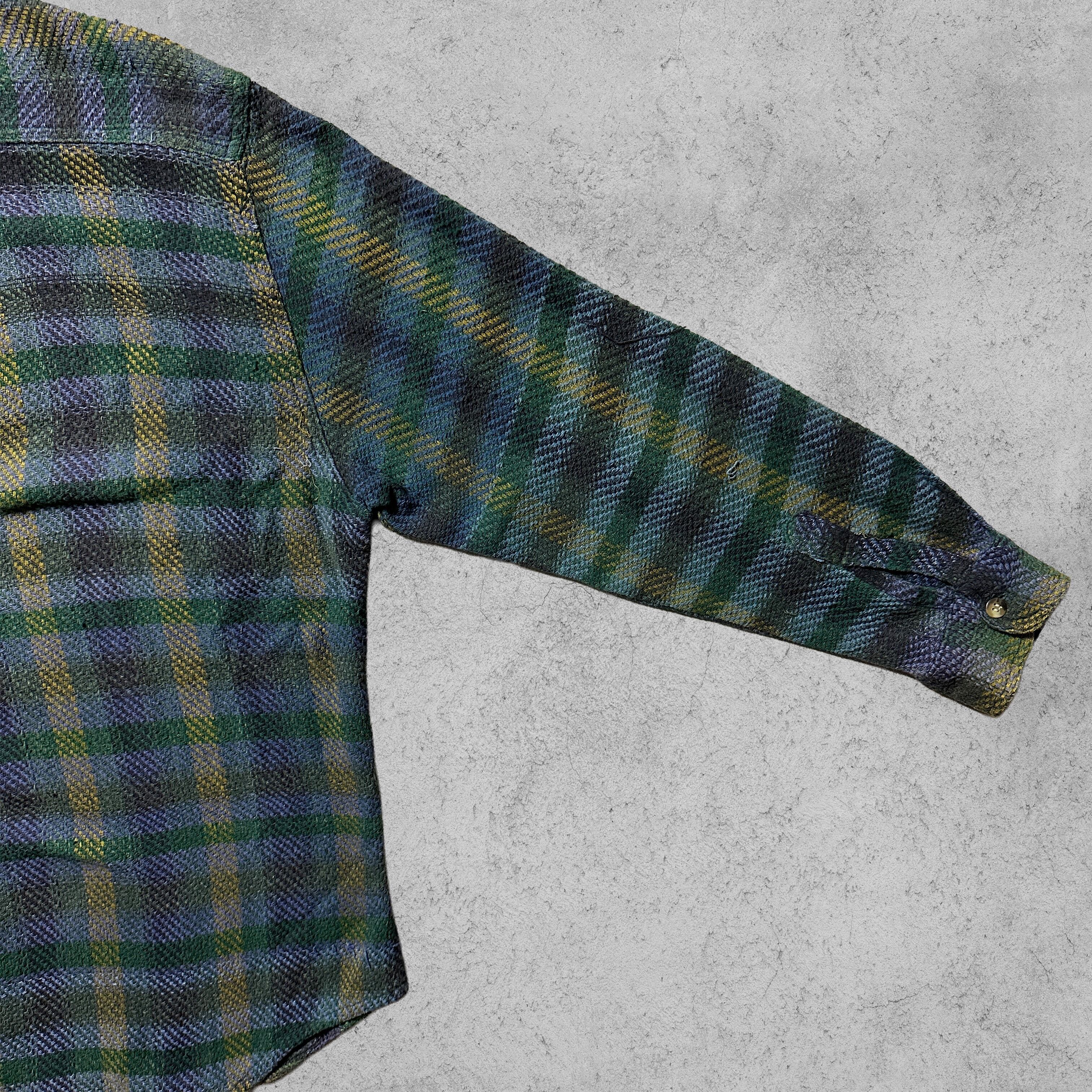 グリーン×ネイビーを基調に、イエローラインが効いたチェック柄が印象的なフランネルシャツ。やや起毛感の強いヘビーフランネル生地で、見た目にも奥行きがあり、無地には出せない存在感がある。シンプルなレギュラーカラー、シングルポケット仕様で、柄の強さを程よく中和したバランスの良いデザイン。