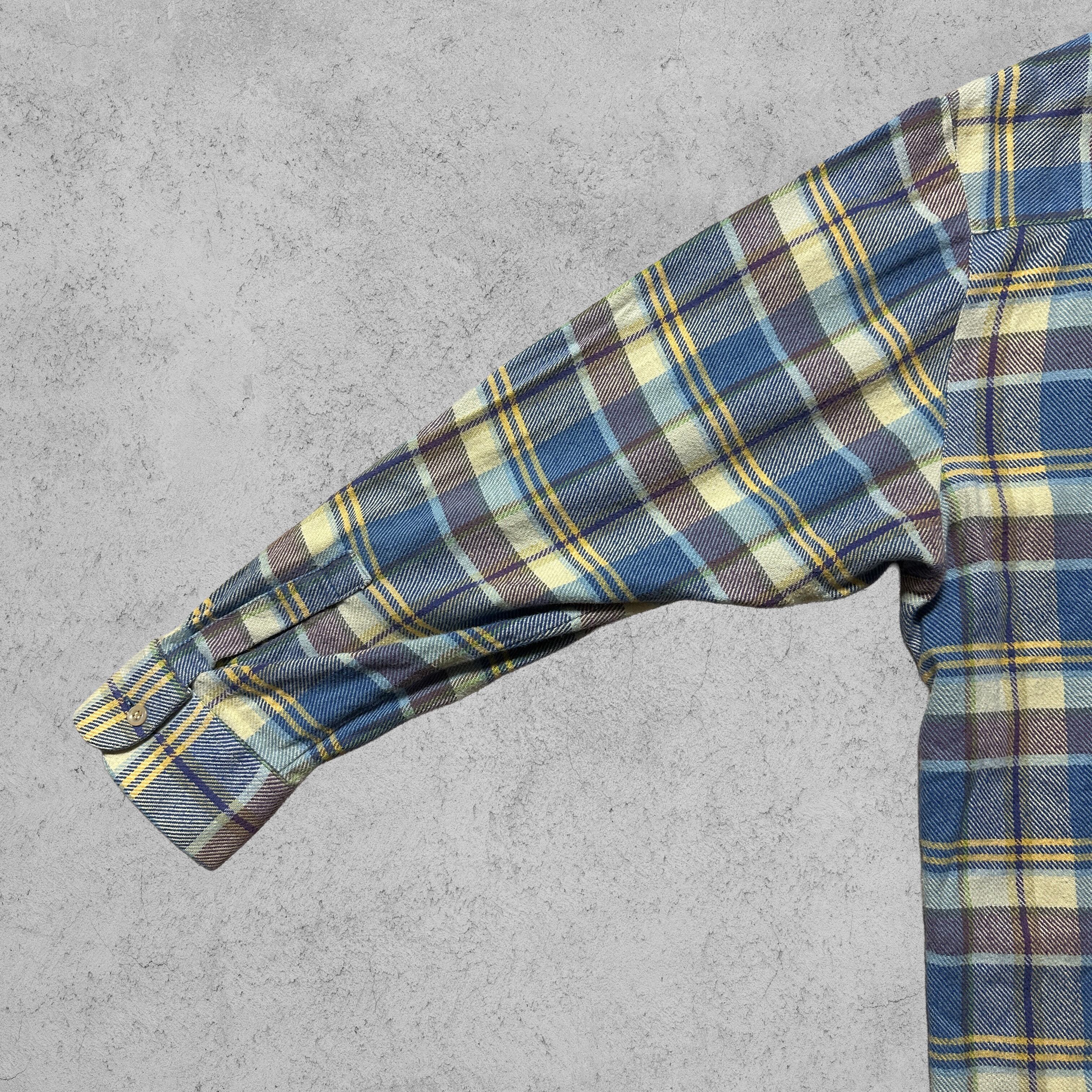 ブルーをベースに、イエローとブラウン、生成りが交差するチェック柄が特徴。配色は明るすぎず、土臭さも抑えめで、ネルシャツ初心者でも取り入れやすいバランス。レギュラーカラーにシングルポケットというシンプルな構成で、柄の良さがしっかり主役になるデザイン。