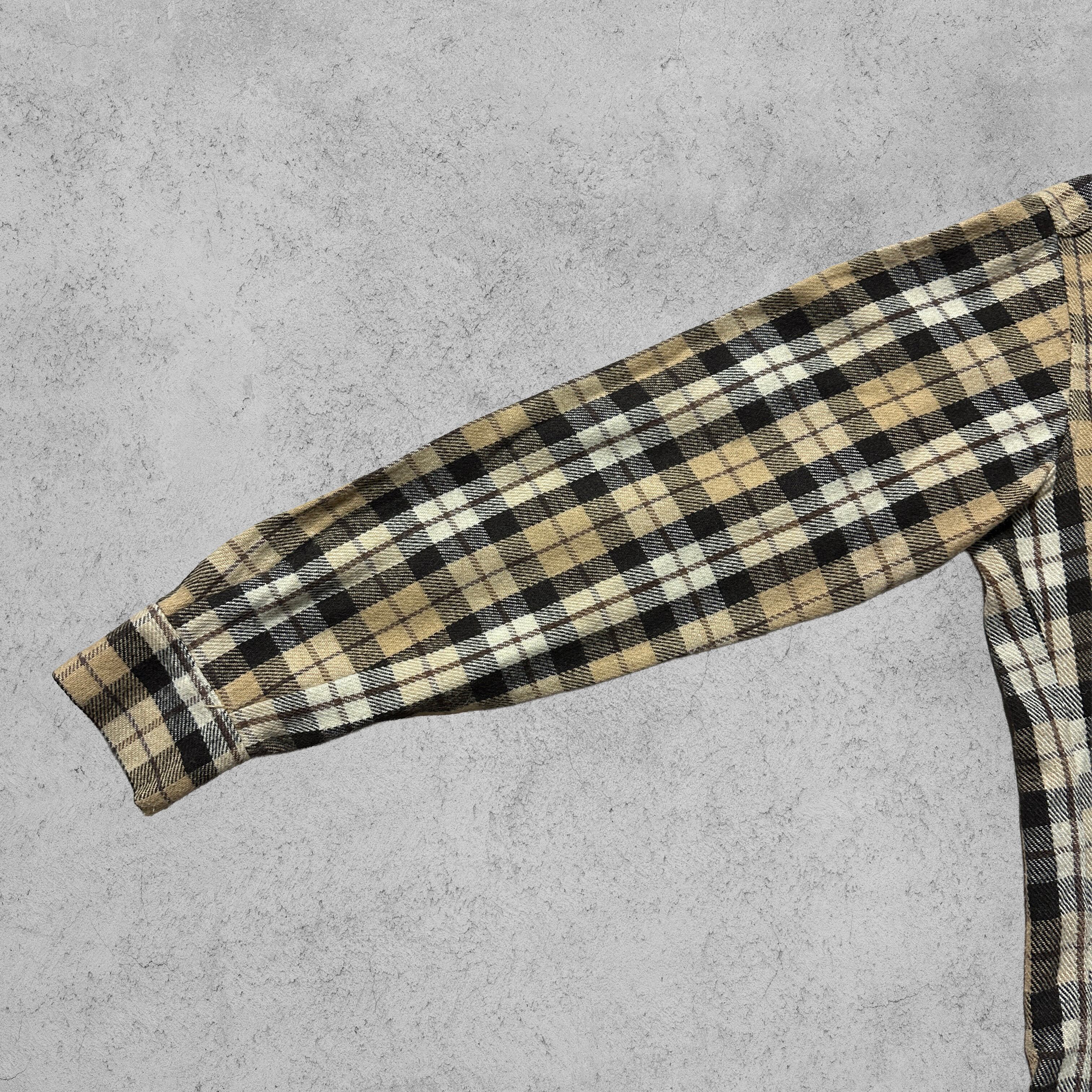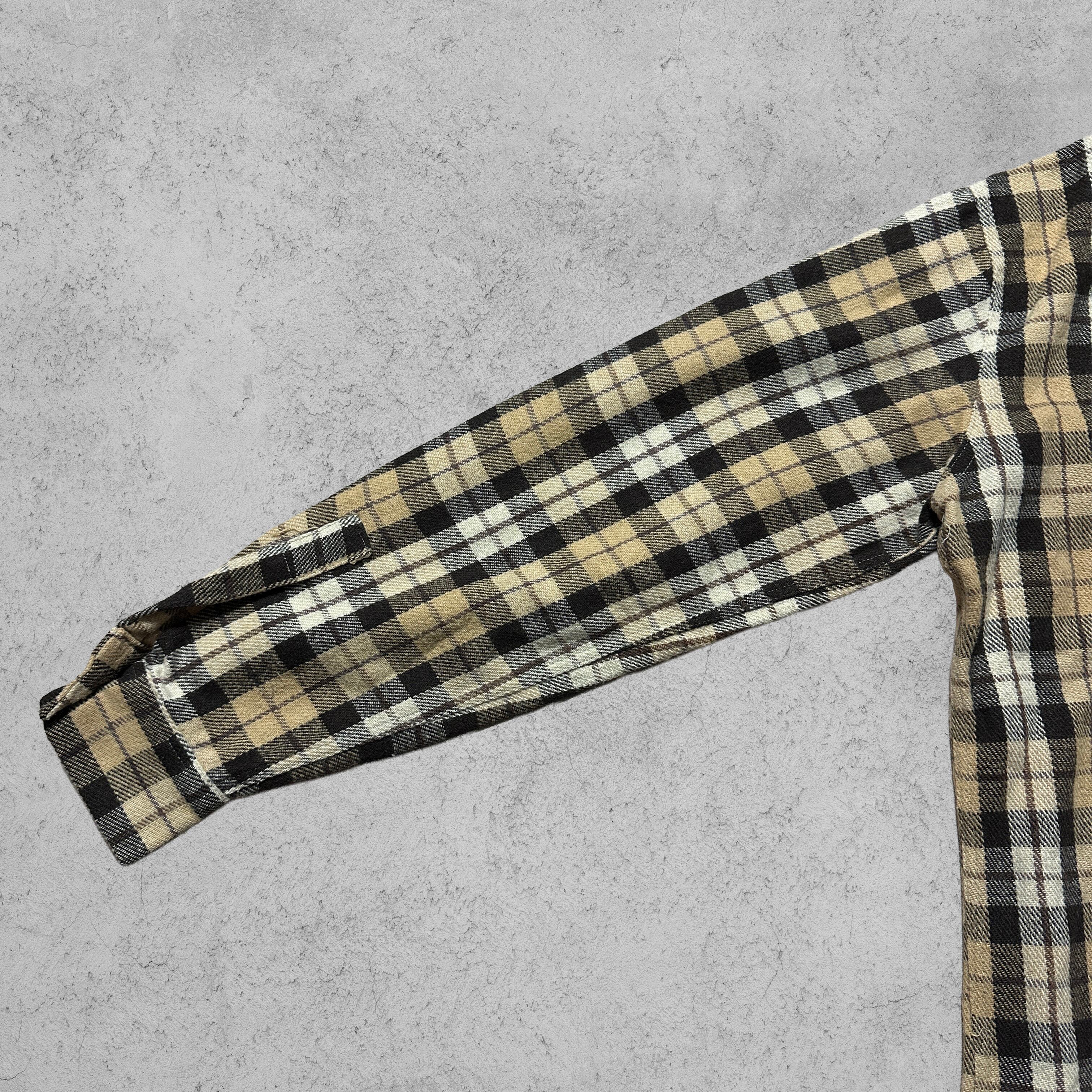 ベージュ×ブラック×生成りの落ち着いたブロックチェック柄が特徴のヘビーネルシャツ。派手すぎず、土っぽい配色で合わせやすい一枚。