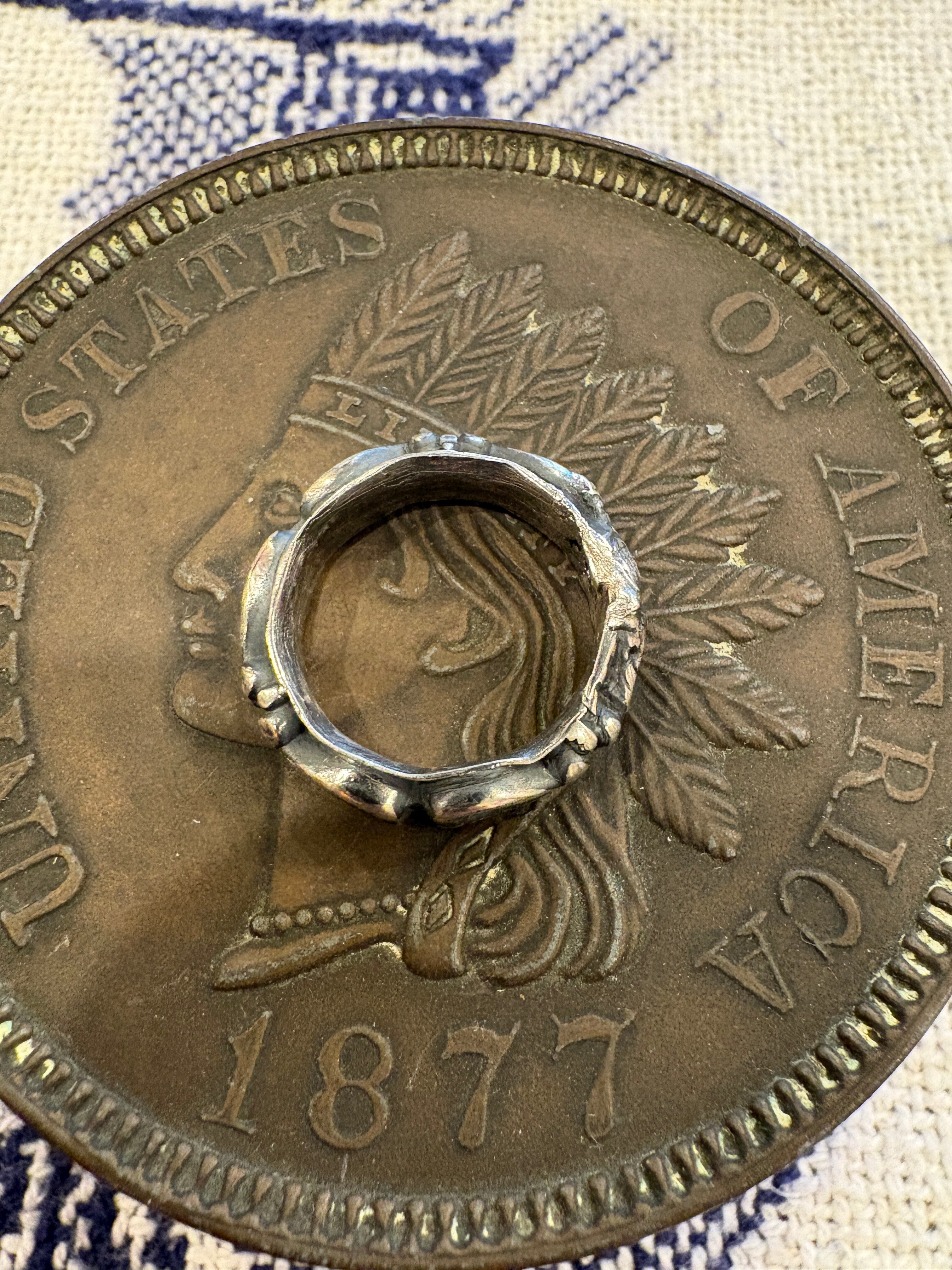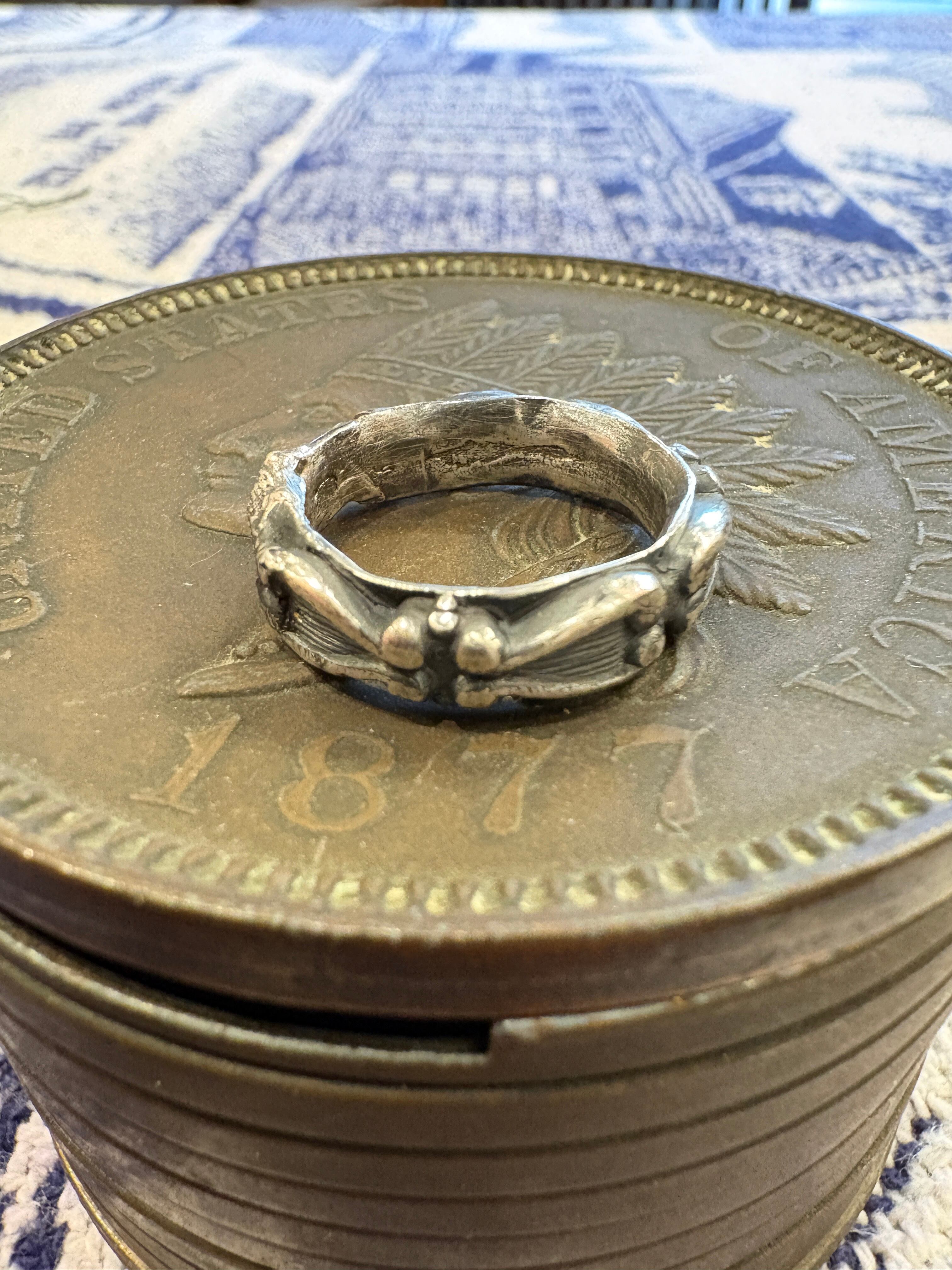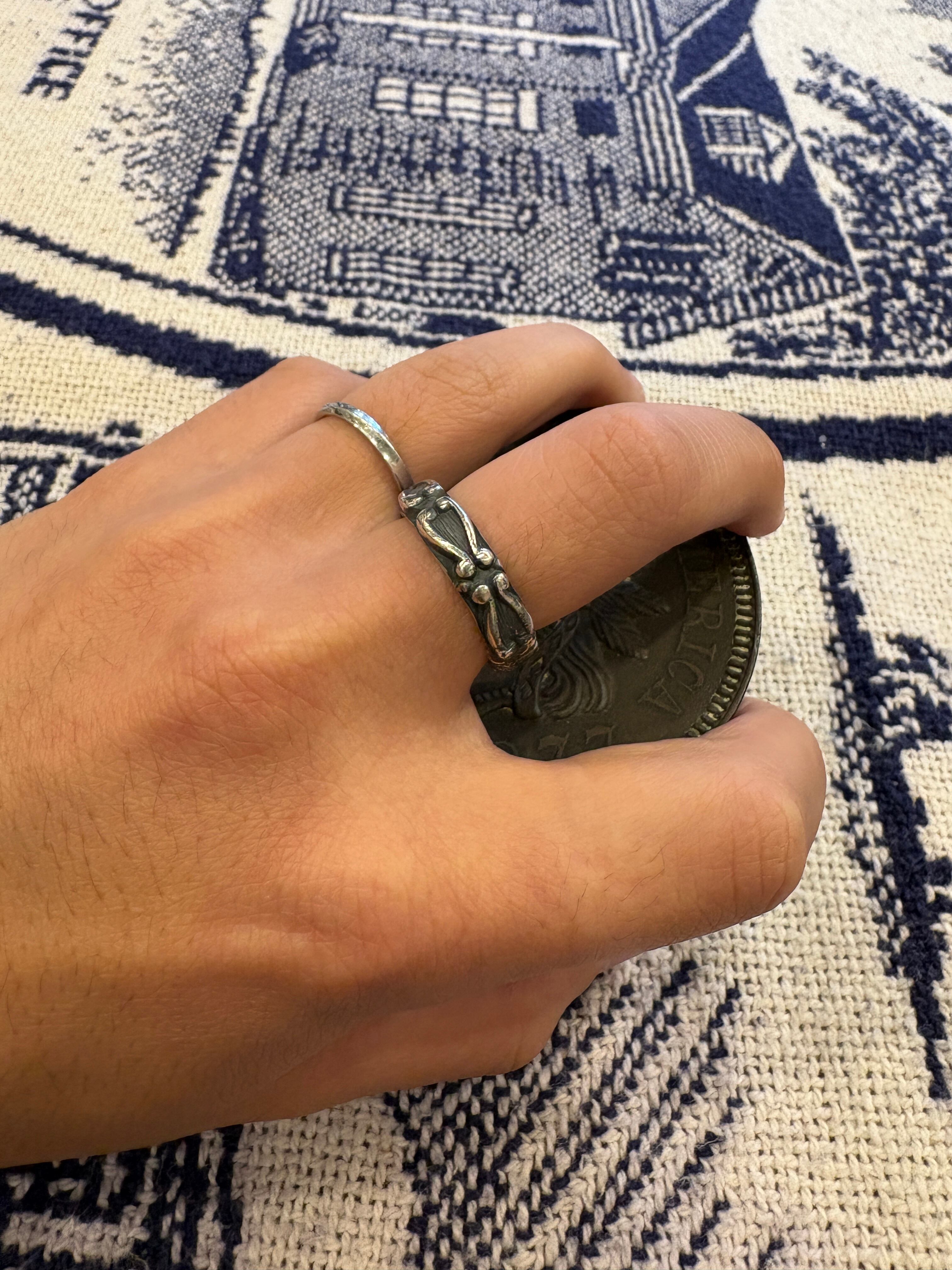 職人が銀粘土から作り上げた、全面にうねりのあるスクロール/アラベスク模様を回し彫りしたクラフトシルバーリング。植物のつぼみのような膨らみと流線のレリーフが立体的で、燻し(いぶし)をあえてつけたダークトーンでヴィンテージ感を演出しています。