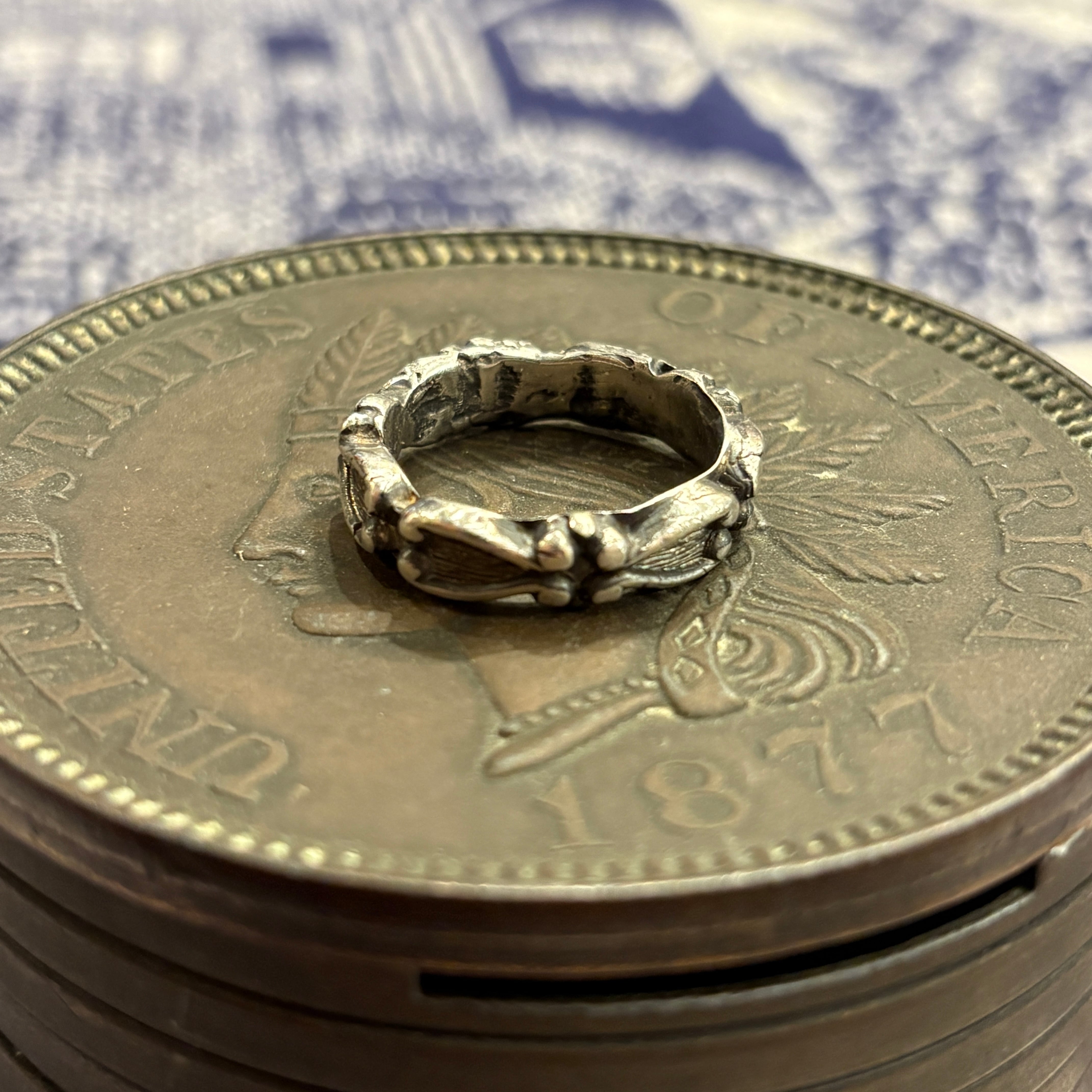 職人が銀粘土から作り上げた、全面にうねりのあるスクロール/アラベスク模様を回し彫りしたクラフトシルバーリング。植物のつぼみのような膨らみと流線のレリーフが立体的で、燻し(いぶし)をあえてつけたダークトーンでヴィンテージ感を演出しています。